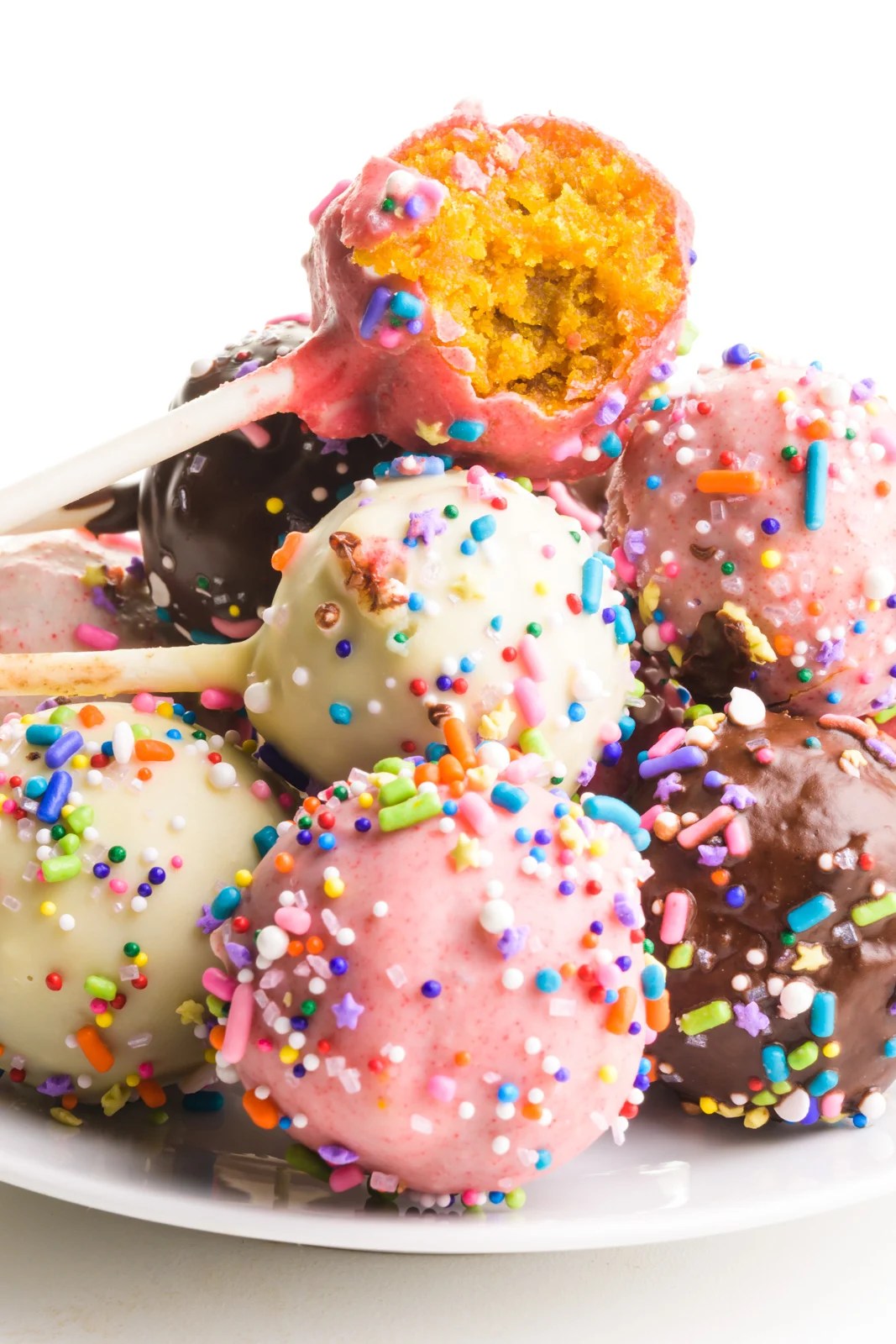 Great baking activity with kids and tasty treats without dairy and eggs. This easy vegan cake pops recipe features moist cake balls covered in chocolate and dipped in sprinkles. It's a perfect party food all year!