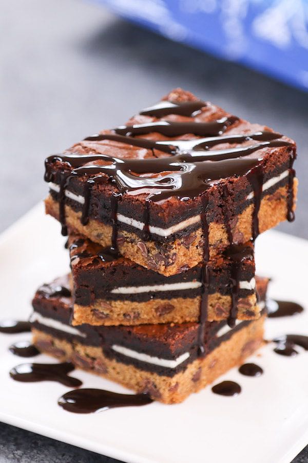 Cut down on the flour. The rich and delicious layers take this dessert to the next level. Chocolate chip cookie dough, oreo cookies, and brownie batter.